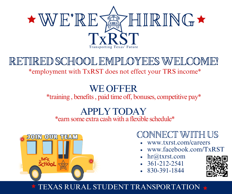 Texas Rural Student Transportation, the company that coordinates student transportation for Connally ISD is now hiring drivers! For more information, contact TxRST directly via email at hr@txrst.com.