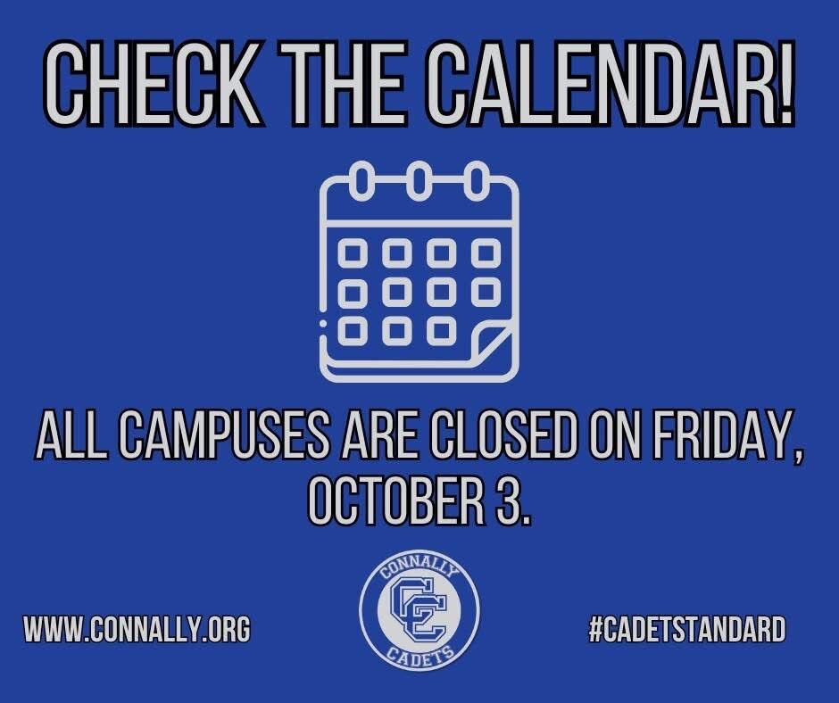 Friday, October 3 is a non-instructional day. Students will not attend classes. Students will report back to school on Monday, October 6. A full copy of this year's calendar can be found here: htt. . .