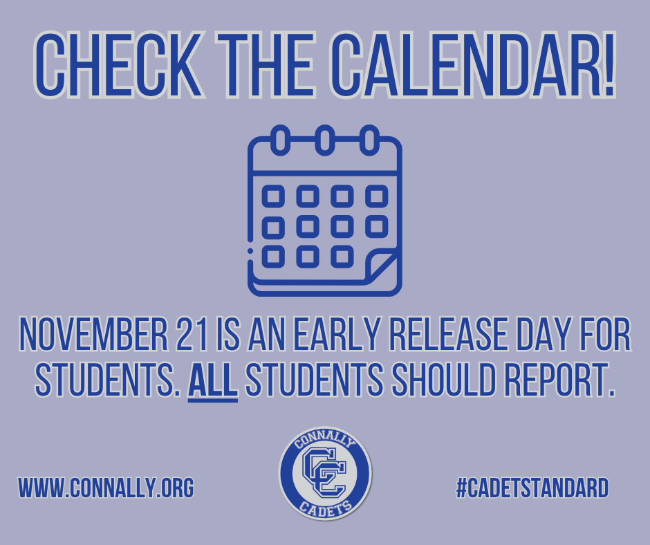 All Connally ISD campuses will operate on an EARLY RELEASE schedule on November 21, 2025. ALL students should be in attendance for a half day of instruction.Dismissal times can be found here: https...